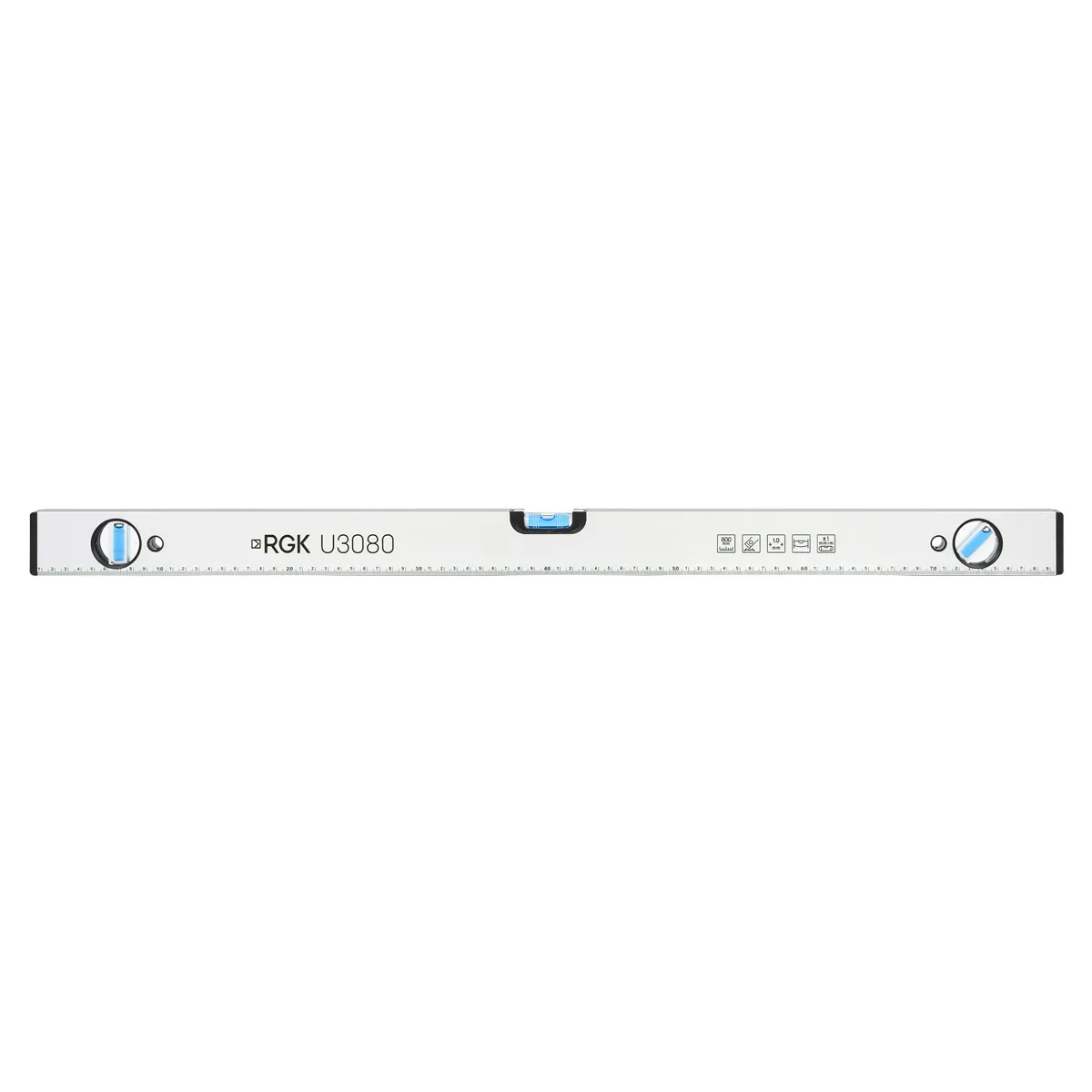 Рабочая длина уровня составляет 800 мм. Эта модель изготовлена из алюминиевого профиля прямоугольного сечения с пластиковыми заглушками по бокам, Инструмент оснащен тремя капсулами с разным угловым положением, заполненными незамерзающим раствором синего цвета, в котором воздушный пузырек строительного уровня RGK U3080 хорошо различим даже при слабом освещении и при выполнении работ в защитных очках.